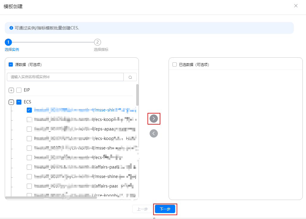 - 选择实例,勾选需要采集指标数据的云服务实例,单击