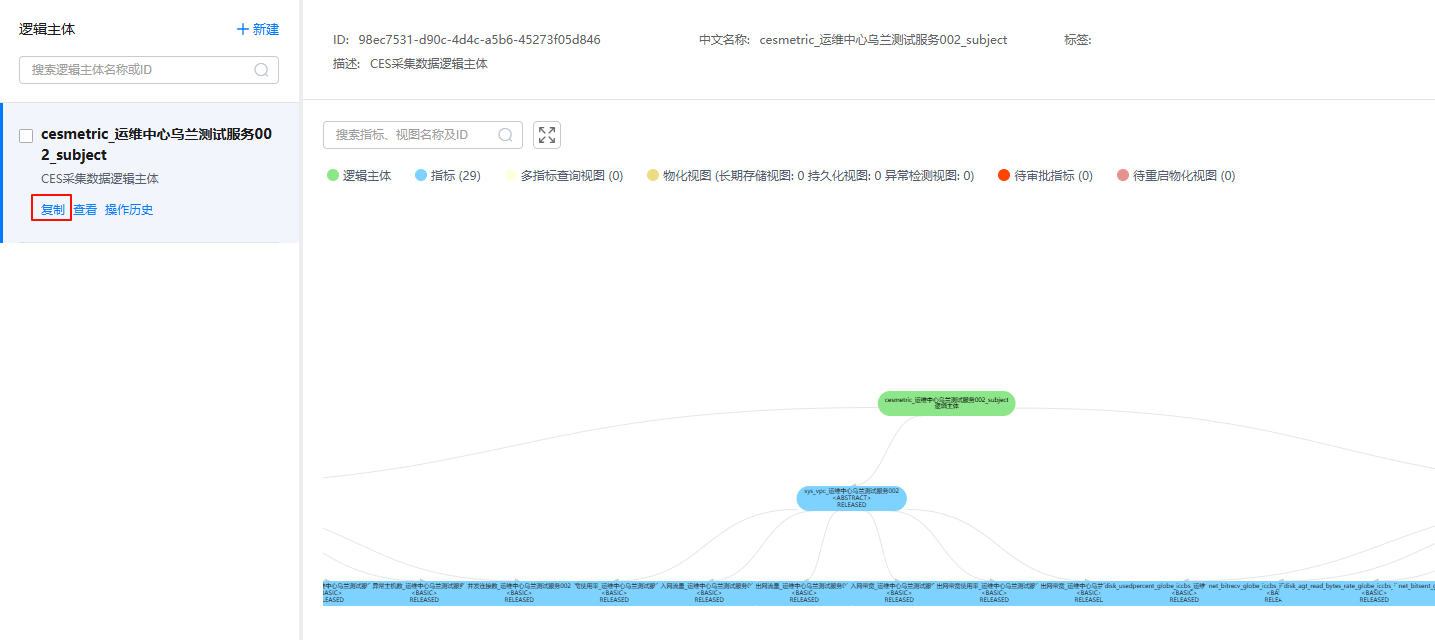 在运维中心指标仓库中创建指标,后续可以使用指标进行数据业务报表开发、告警配置等运维监控。创建指标前需要先创建逻辑主体,将数据表中的字段添加进逻辑主体中,然后基于逻辑主体创建指标。运维中心监控j9九游会登录的服务支持在ces页面的“模板”页签一键生成ces采集数据逻辑主体及相关指标,这些指标可以直接用于报表开发,同时可以单击逻辑主体下的“复制”,复制逻辑主体及指标,复制后的逻辑主体和指标可以编辑修改,如图1所示。本章节介绍如何创建逻辑主体及指标。