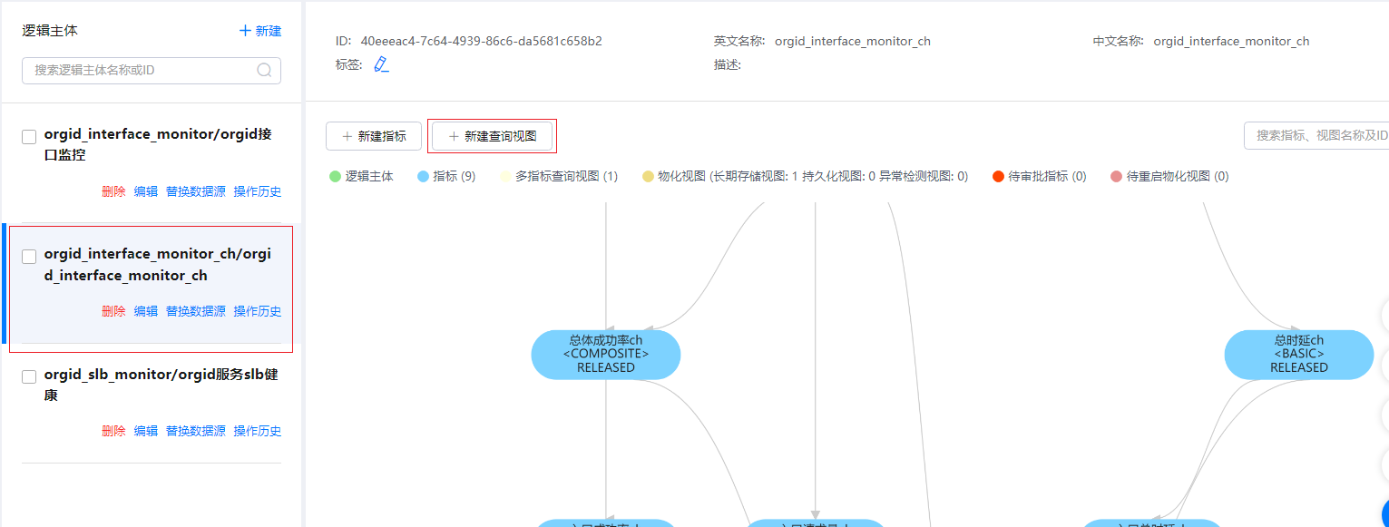 - 在“指标仓库”页面,选择需创建视图的逻辑主体,默认显示“关系图模式”,可以单击页面已创建的指标或视图,弹出“指标”页面或“视图”页面。