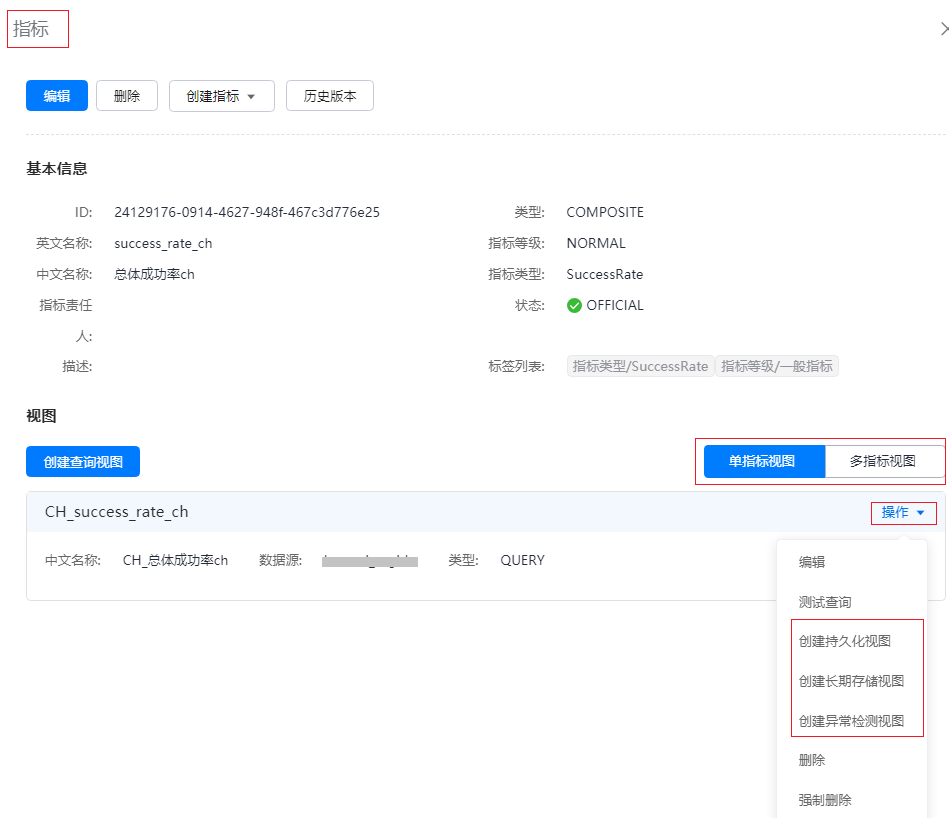 - 在“指标”页面,选择已创建的单指标视图或多指标视图,单击视图的“操作”,在下拉列表中选择“创建持久化视图”、“创建长期存储视图”或“创建异常检测视图”,如图2所示。