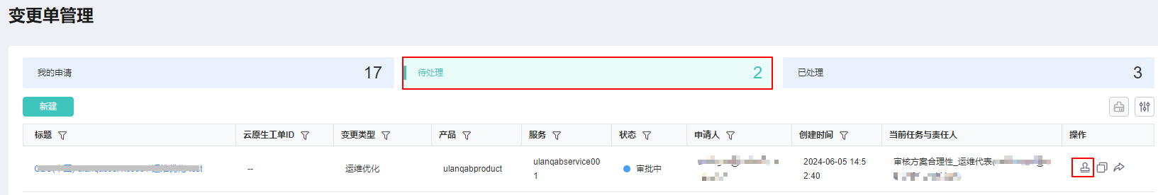 - 将鼠标悬停在右上角的账号,选择下拉列表中的“工单管理”,默认显示“变更单管理”页面。
