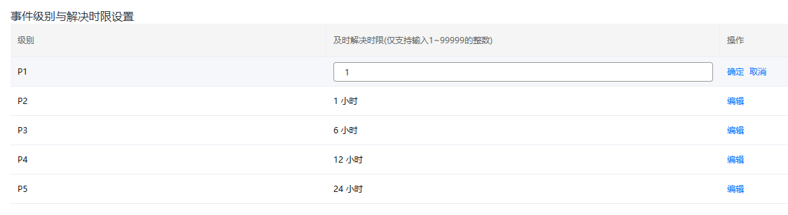 - 解决时限:当前事件级别为p1~p5,及时解决时限默认设置为1小时,可以根据业务要求设置事件及时解决时限。