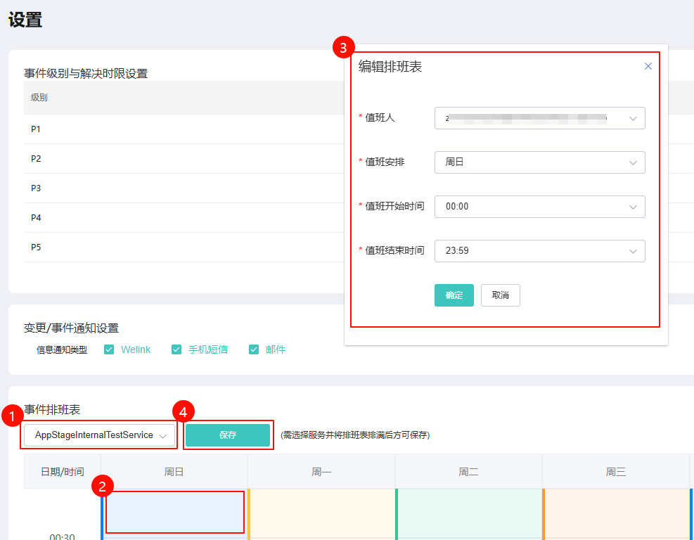支持对事件单的解决时限、通知方式及排班表进行设置。