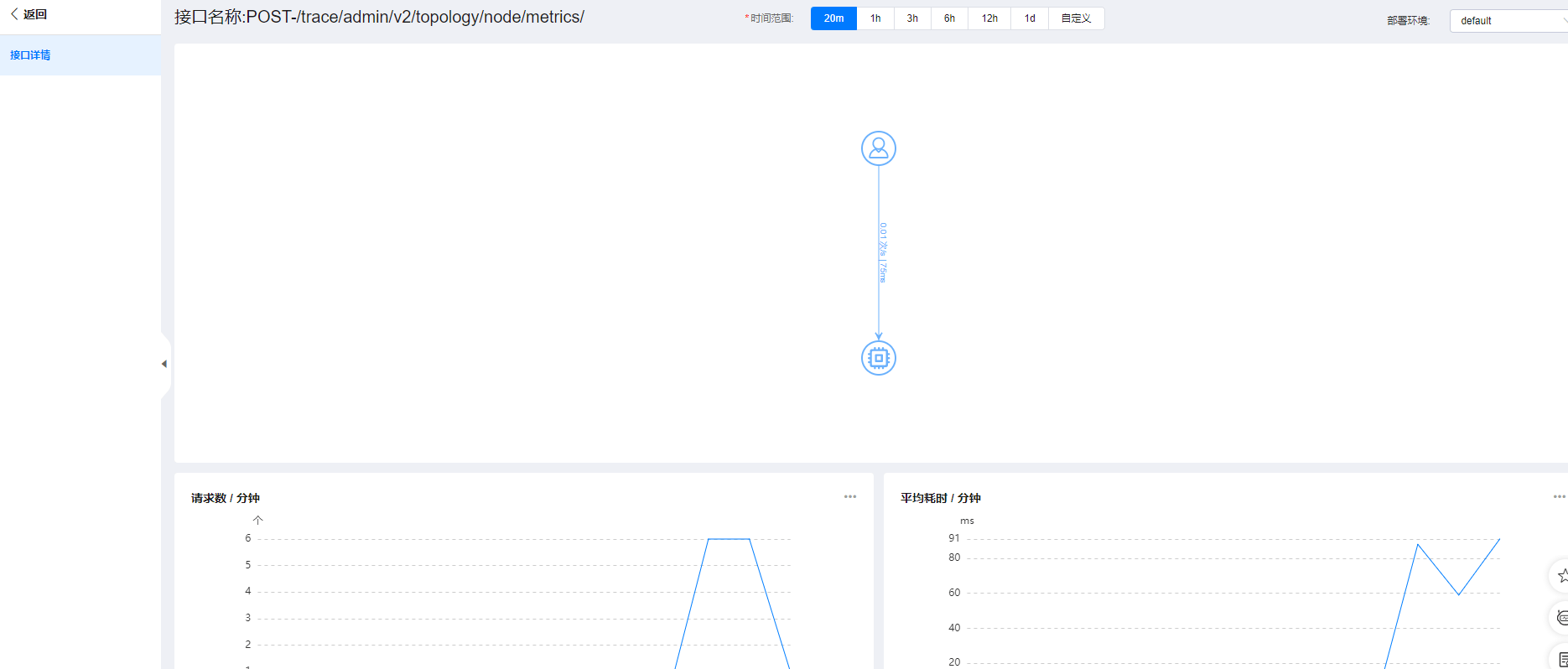 单击接口名称,可以查看接口的调用拓扑(包含请求的tps、平均耗时)、请求数、平均耗时、错误数、慢调用等。