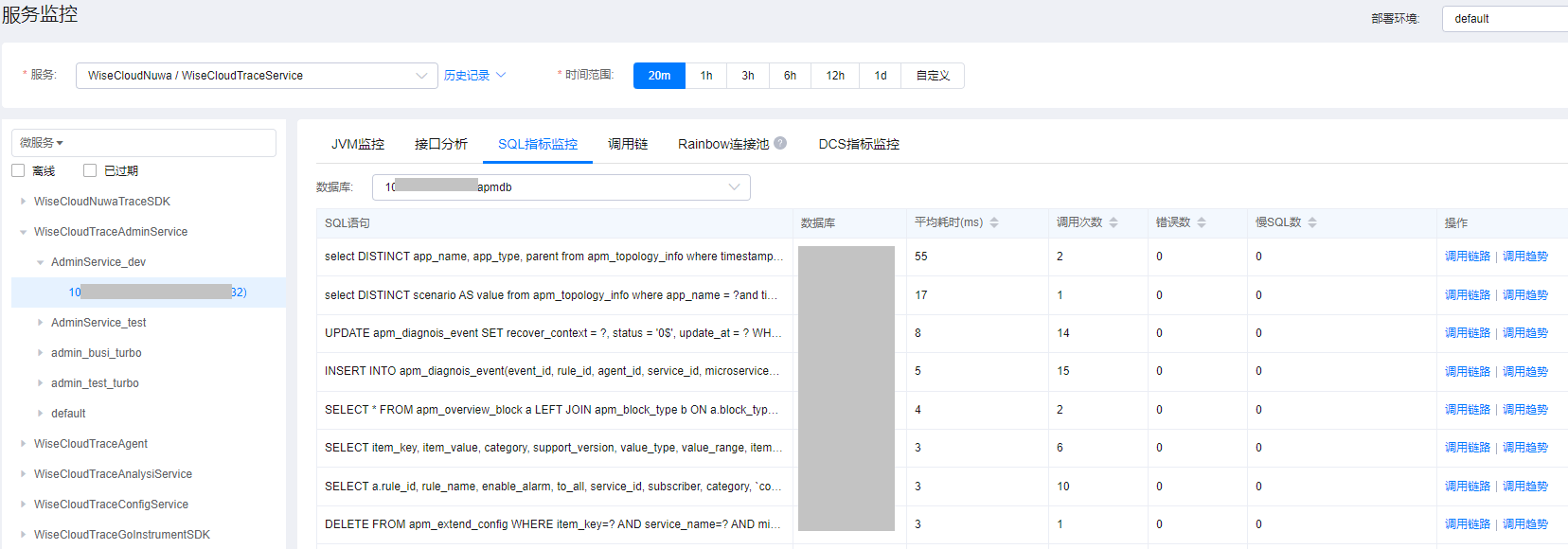 接入nuwa trace agent后,调用链服务会对sql语句的调用情况进行监控,支持查看微服务、集群、ip三种级别的不同维度的sql调用情况,包括调用的数据库名称、schema名称、原始sql语句、性能指标(平均耗时、调用次数、错误数、慢sql)。