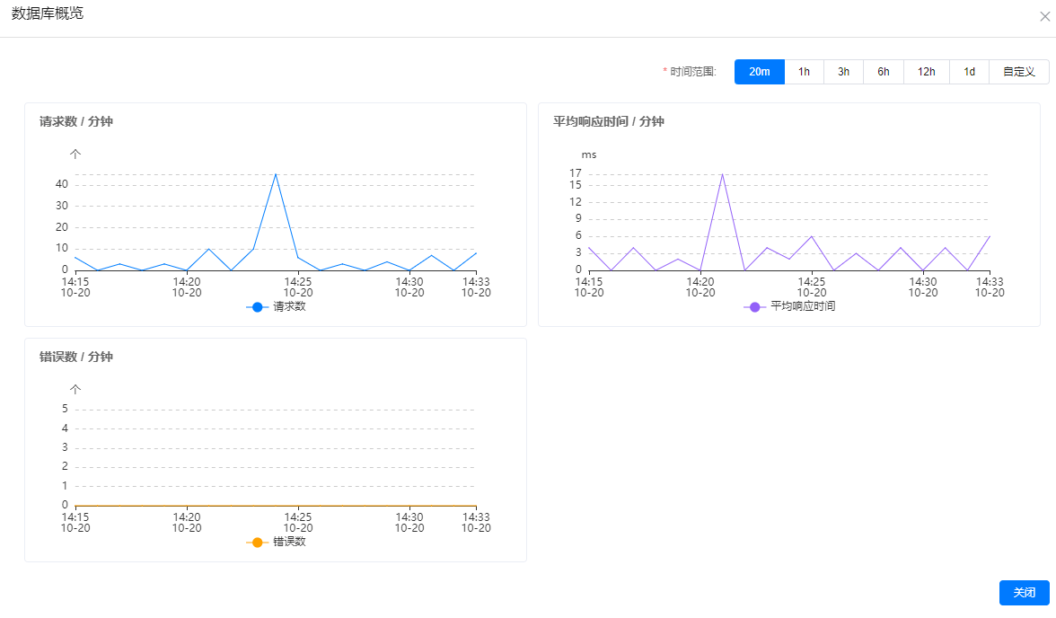 单击某一数据库,查看指定时间范围内的数据库性能情况,如图2所示。图2 数据库概览