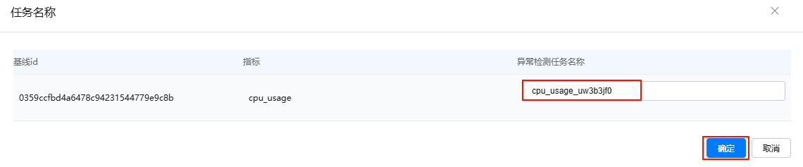 - 确认生成的异常检测任务名称(根据指标名称拼接随机数生成),可修改,然后单击“确定”,如图2所示。