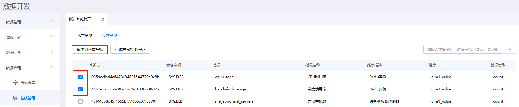 - 公共基线:运维中心预置的基线指标,可以使用公共基线指标快速创建异常检测任务,同时可以将公共基线指标同步至私有基线,进行编辑。