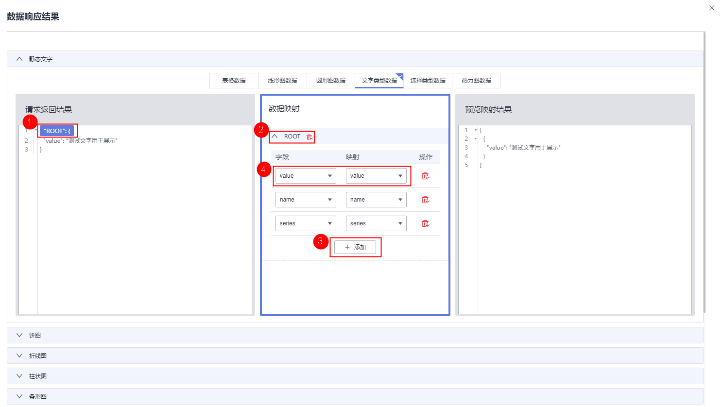 单击“查看服务返回结果”,进入“数据响应结果”页面,进行数据影射,如图1所示,配置完成后自动保存。如果不配置,则在“组件属性 > 基础属性 > 绑定数据”下拉框中选择不到数据。