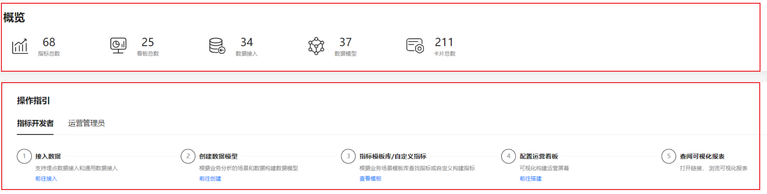 概览区域展示指标总数、看板总数、数据接入总数、数据模型总数和卡片总数。并提供操作指引的入口链接。