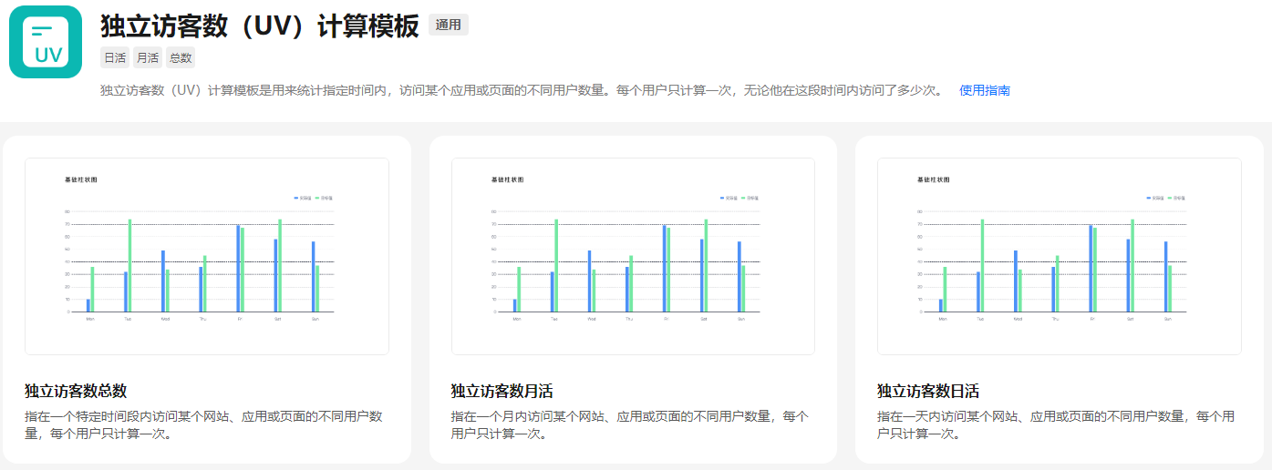独立访客数(uv)计算模板是用来统计指定时间内,访问某个应用或页面的不同用户数量。每个用户只计算一次,无论他在这段时间内访问了多少次。