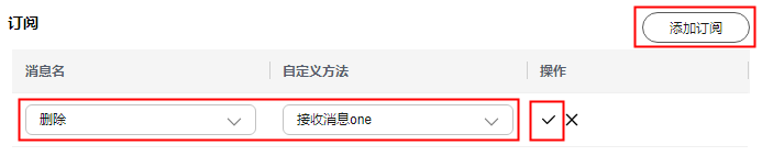 单击“添加订阅”,选择“消息名”、“自定义方法”,选择完成后在操作列单击