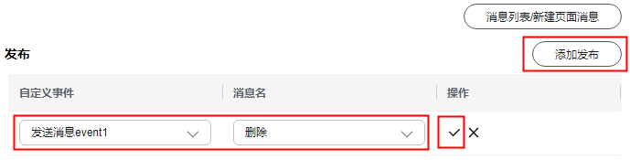 单击“添加发布”,选择“自定义事件”、“消息名”,选择完成后在操作列单击