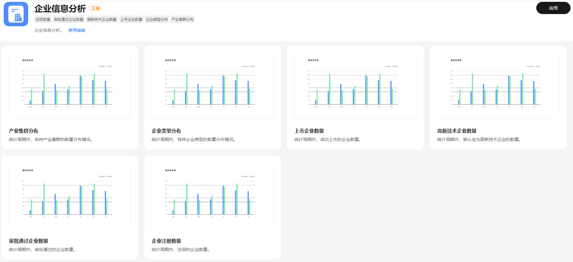 统计周期内,通过分析产业集群分布、企业类型分布、上市企业数量、高新技术企业数量等,帮助用户快速了解企业的情况。