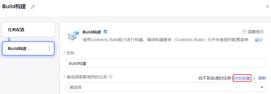 - 在“build构建”页面右侧区域“请选择需要调用的任务”处单击“点击创建”,如图6所示。