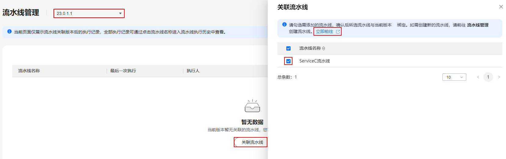 - 在“流水线管理”页面,选择版本,单击“关联流水线”,在“关联流水线”页面,根据界面提示单击“立即前往”,可以进入codearts页面创建流水线,如图1所示。