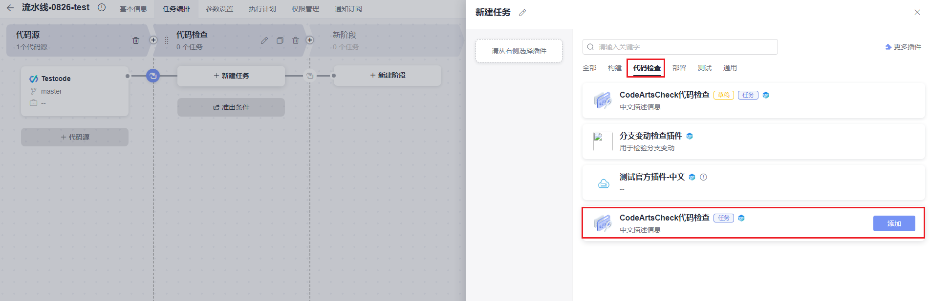 - 在“新建任务”页面的右侧区域,选择“代码检查”页签,单击“codeartscheck代码检查”后的“添加”,将此插件添加到任务中,如图4所示。