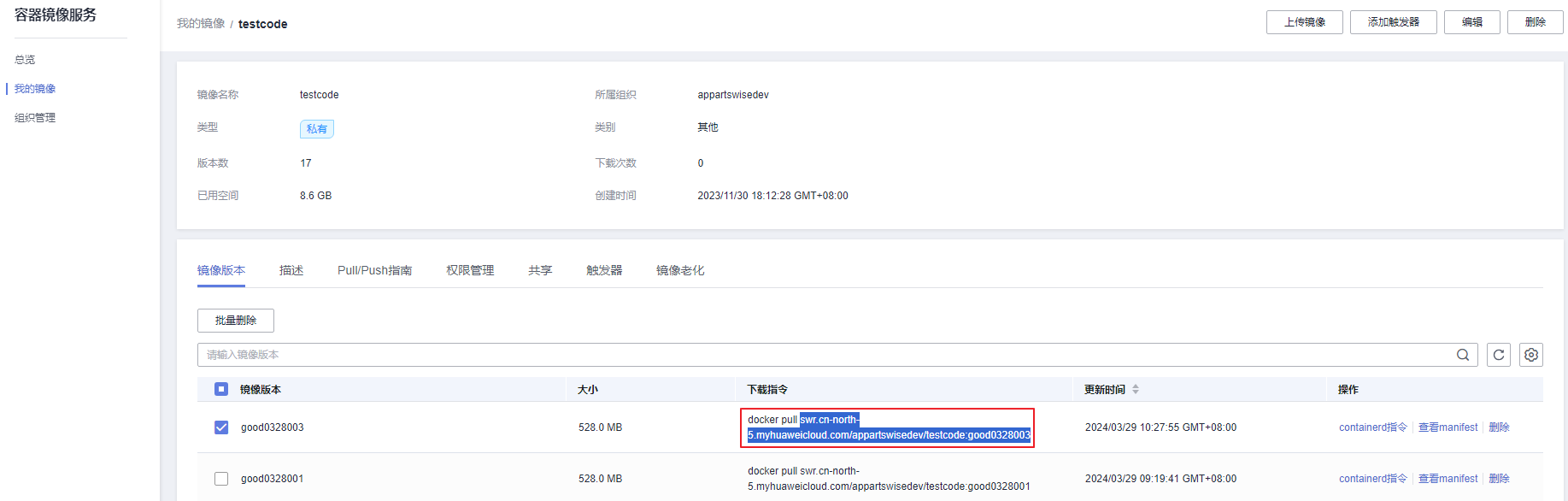 - 返回华为云容器镜像服务控制台镜像列表中单击镜像tar包名称,进入镜像详情页面,选择“pull/push指南”页签,单击“操作步骤”中的“生成登录指令”。