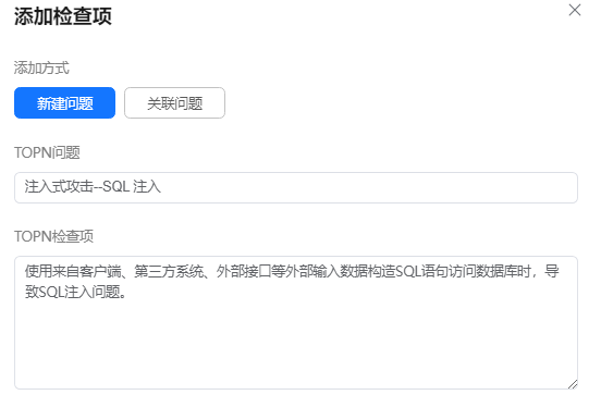 - 关联问题:选择已有的topn问题,并输入topn检查项,然后单击“确定”,为已有问题关联新的检查项。