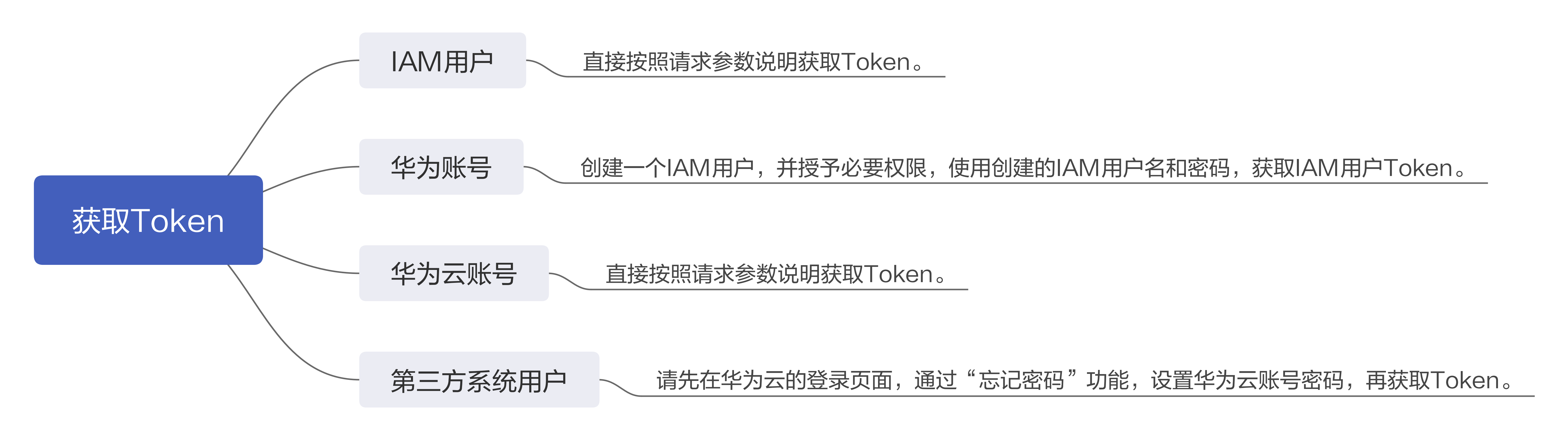 华为账号获取token请参见以下步骤:创建一个iam用户,授予该用户必要的权限,使用创建的iam用户名和密码,获取iam用户token。